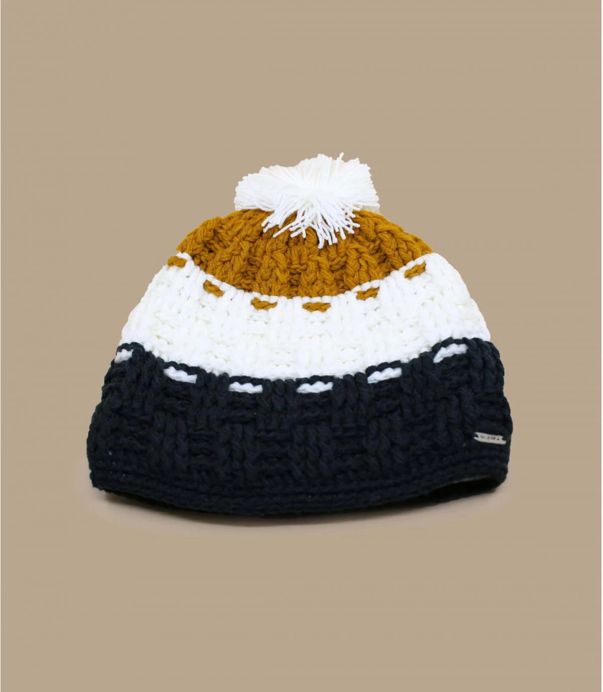 Herenmuts met pompon van Capcho. Zwart, wit en curry wollen muts met fleecevoering, handgebreid in Nepal.