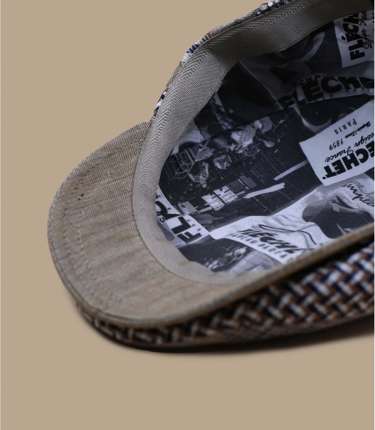 U zult niet onopgemerkt blijven met deze baret van 100% linnen met een originele stijl, gemaakt in Frankrijk. Het heeft een patchwork van verschillende beige prints, grijze ruiten en een blauw en wit in elkaar grijpend netpatroon dat het een dynamische uitstraling geeft.
